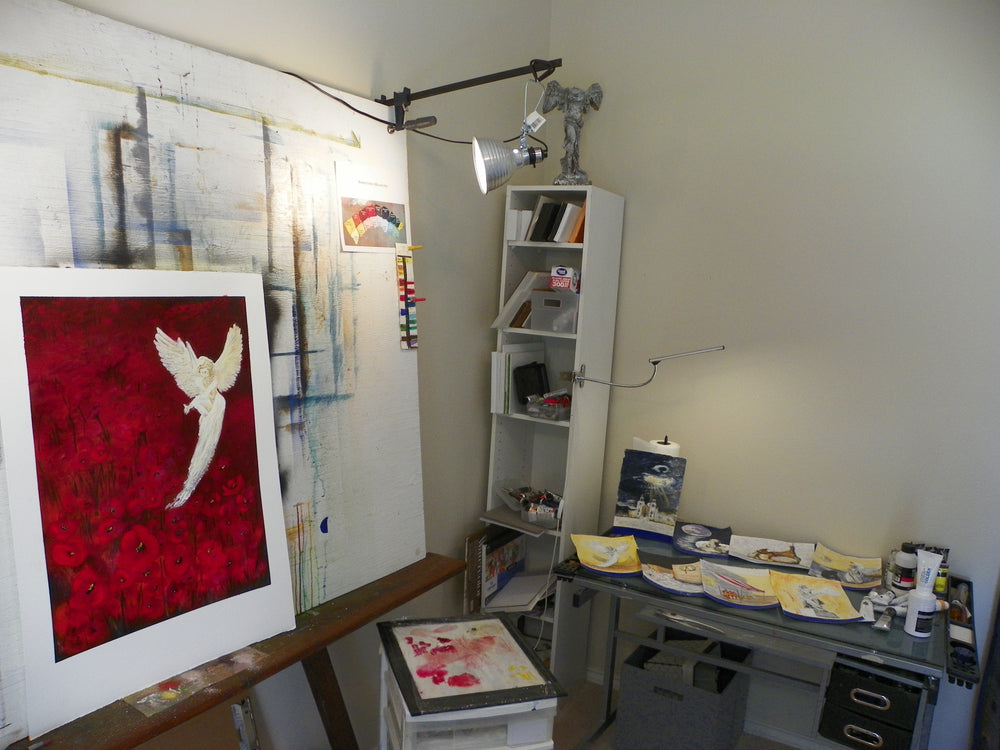 My Original paintings are created here In my Art Studio located in my home. I paint in Series; thus creating sets of paintings. While my plein air paintings are done in Watercolor. My Studio work includes Mixed Media and Oil painting, even spray paint!